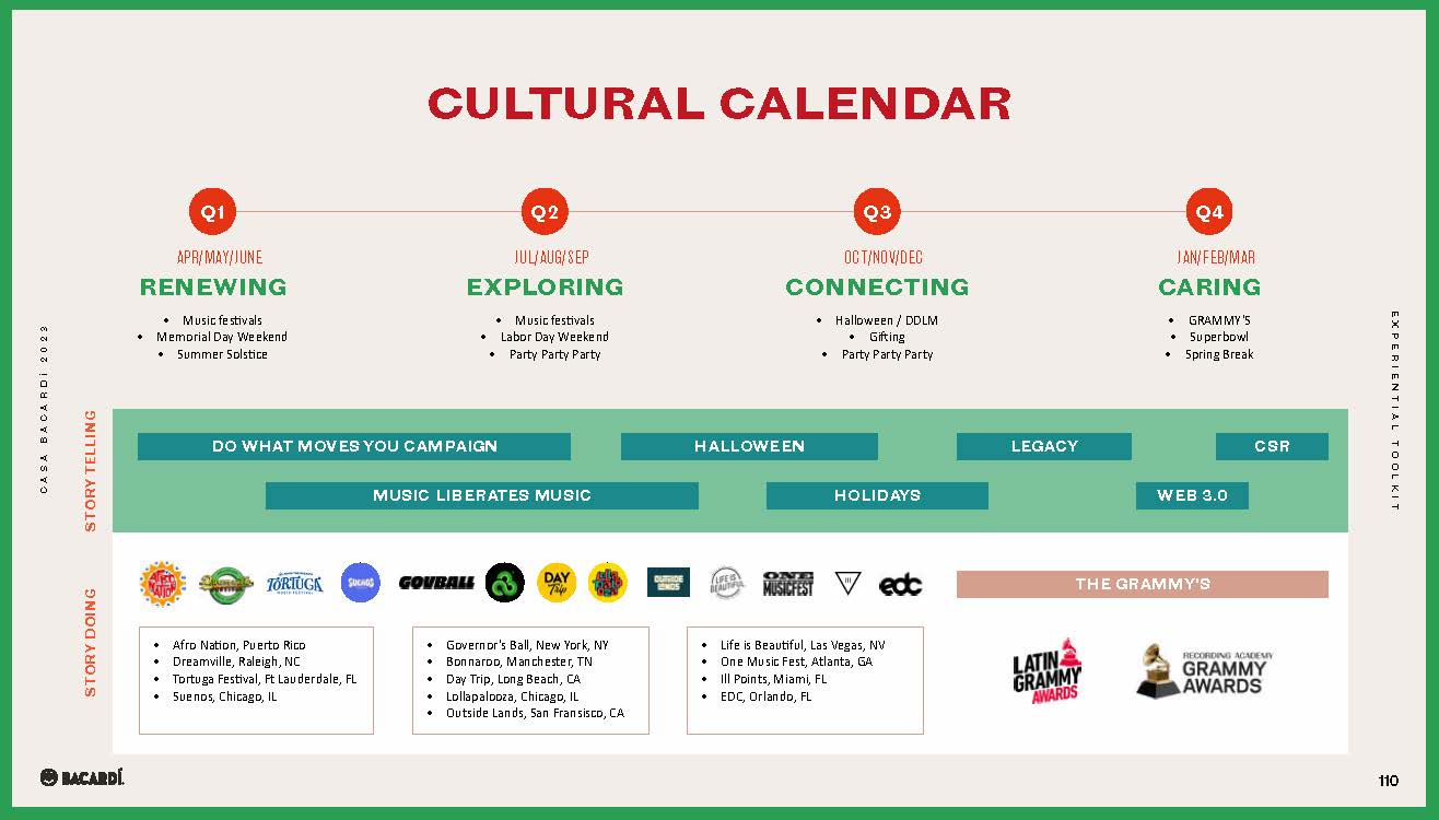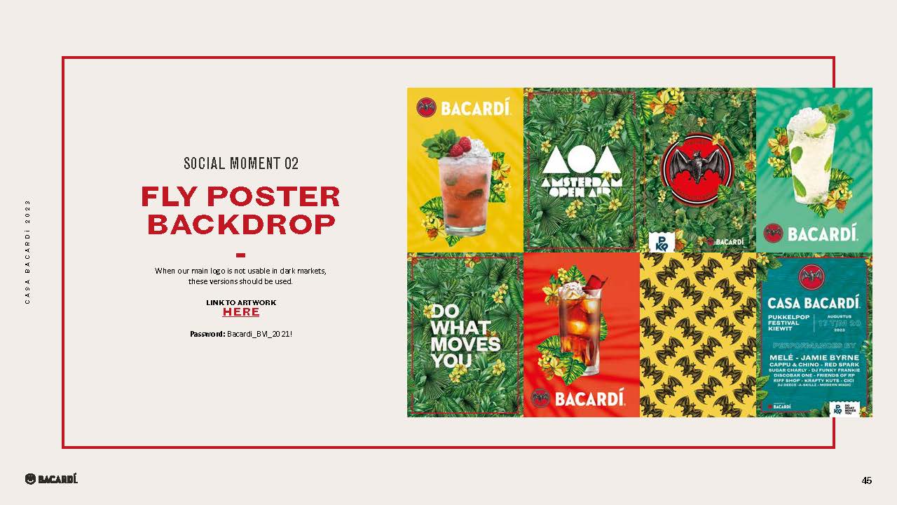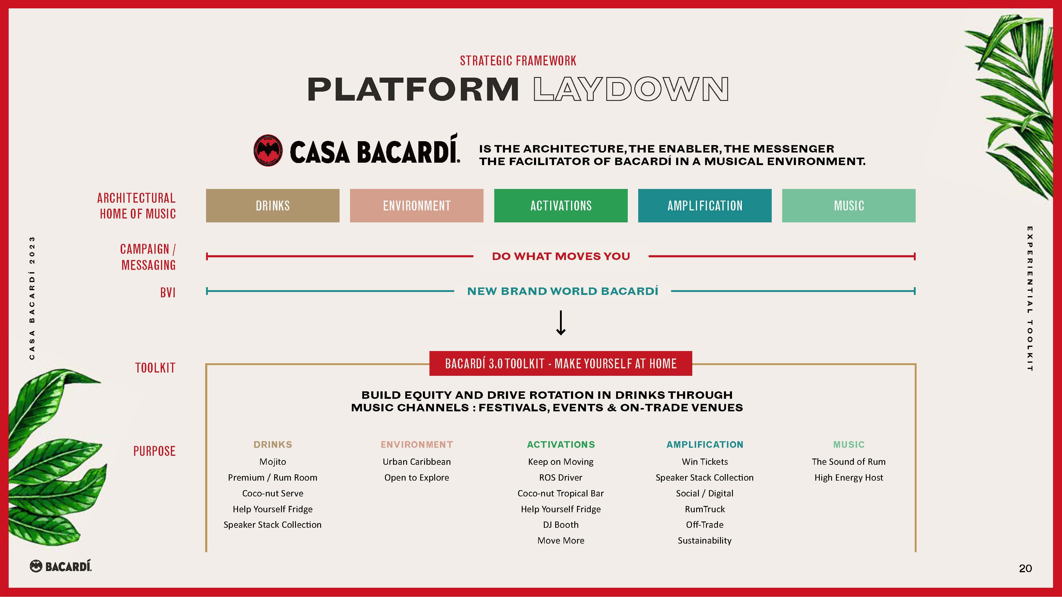 The creation of the Casa BACARDÍ Experiential & Music toolkit. To be used by global markets delivering key assets, offering over arching guidance and inspiration for markets. The documents sole use is to inspire and excite markets for activation utilizing Bacardi’s unique caribbean provenance and distinctive style.